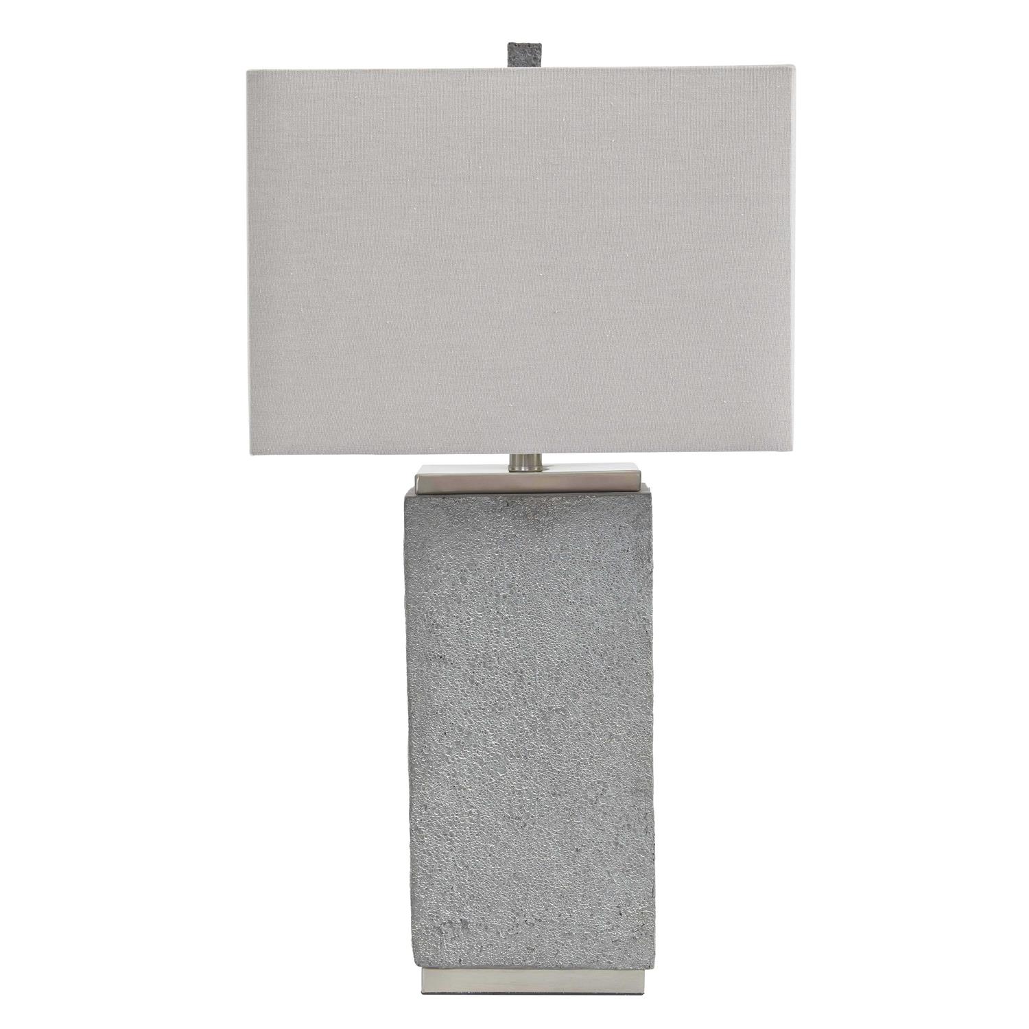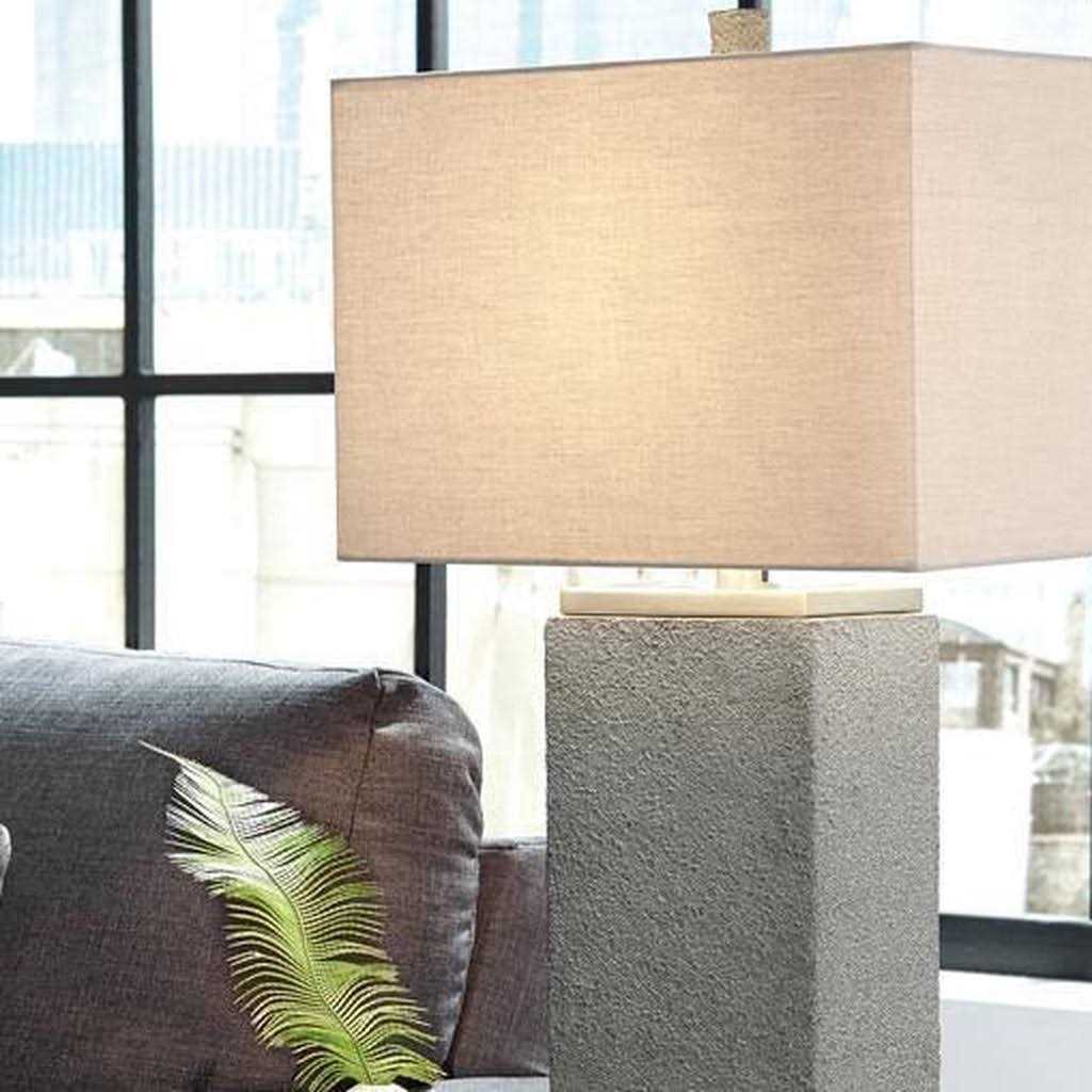 Dimensions: 15W x 10D x 28H in.. Polyresin base. Textured gray finish. Rectangular, white fabric shade. 3-way switch. Requires one 150-watt type A bulb (not included). The polyresin base of the Signature Design by Ashley Amergin Poly Table Lamp – Set of 2 is finished in an easy-to-pair gray hue. It features textured details that give it dimension and depth. This table lamp is topped by a boxy shade that complements its rectangular column.