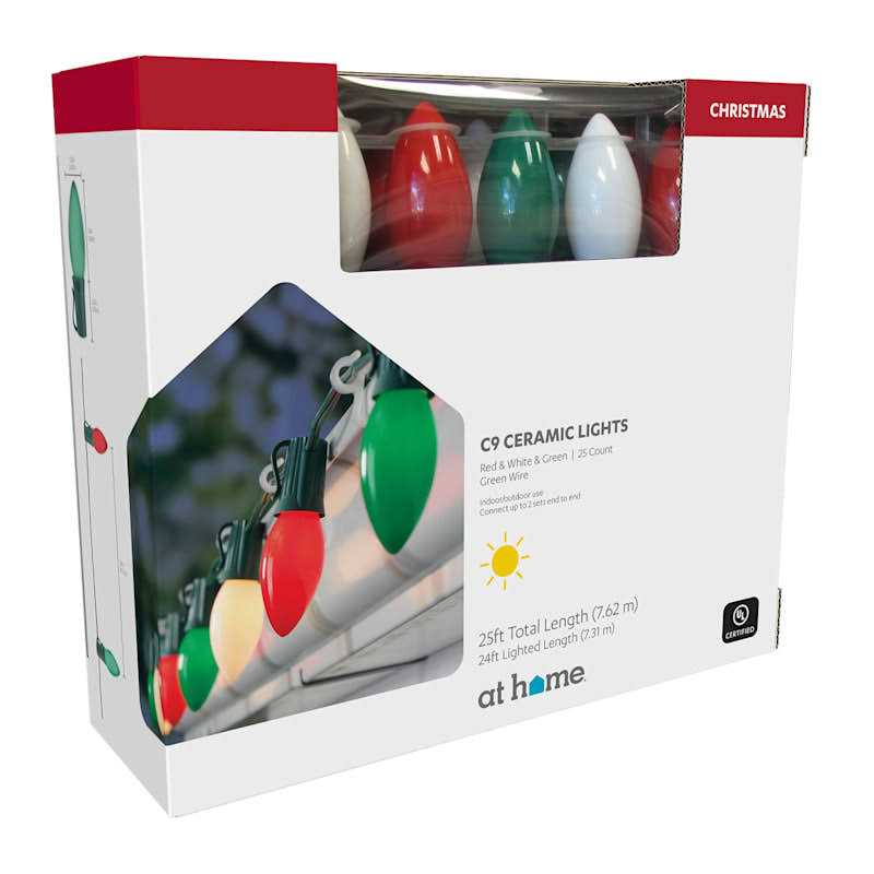 Set the perfect mood year-round with our 25-count red, white, and green C9 ceramic string lights! Its colorful glow adds fun and excitement to any indoor space. These lights are easily wrapped around a Christmas tree or hung around a room and the safety fuse plug and durable coordinating wire will keep it shining for seasons to come.
