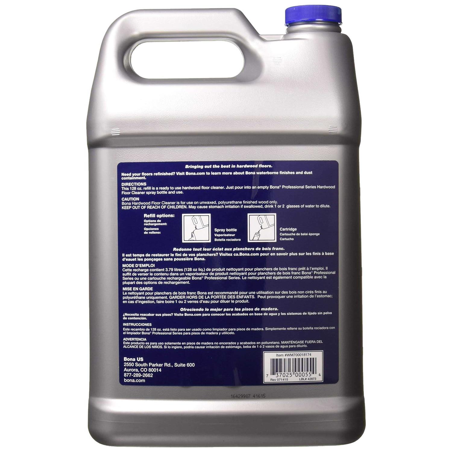 Bona professional Series Hardwood Floor Cleaner is a professional strength, non-toxic waterborne cleaner that is specially formulated for all types of hardwood floors coated with a clear unwaxed finish. Bona professional Series Hardwood Floor Cleaner is a cleaner that will not leave any dulling residue, and is also environmentally responsible. This is a 1 gallon, ready-to-use refill, use it to refill the 32 ounce spray bottles or the 28-3/4-ounce spray mop cartridge.