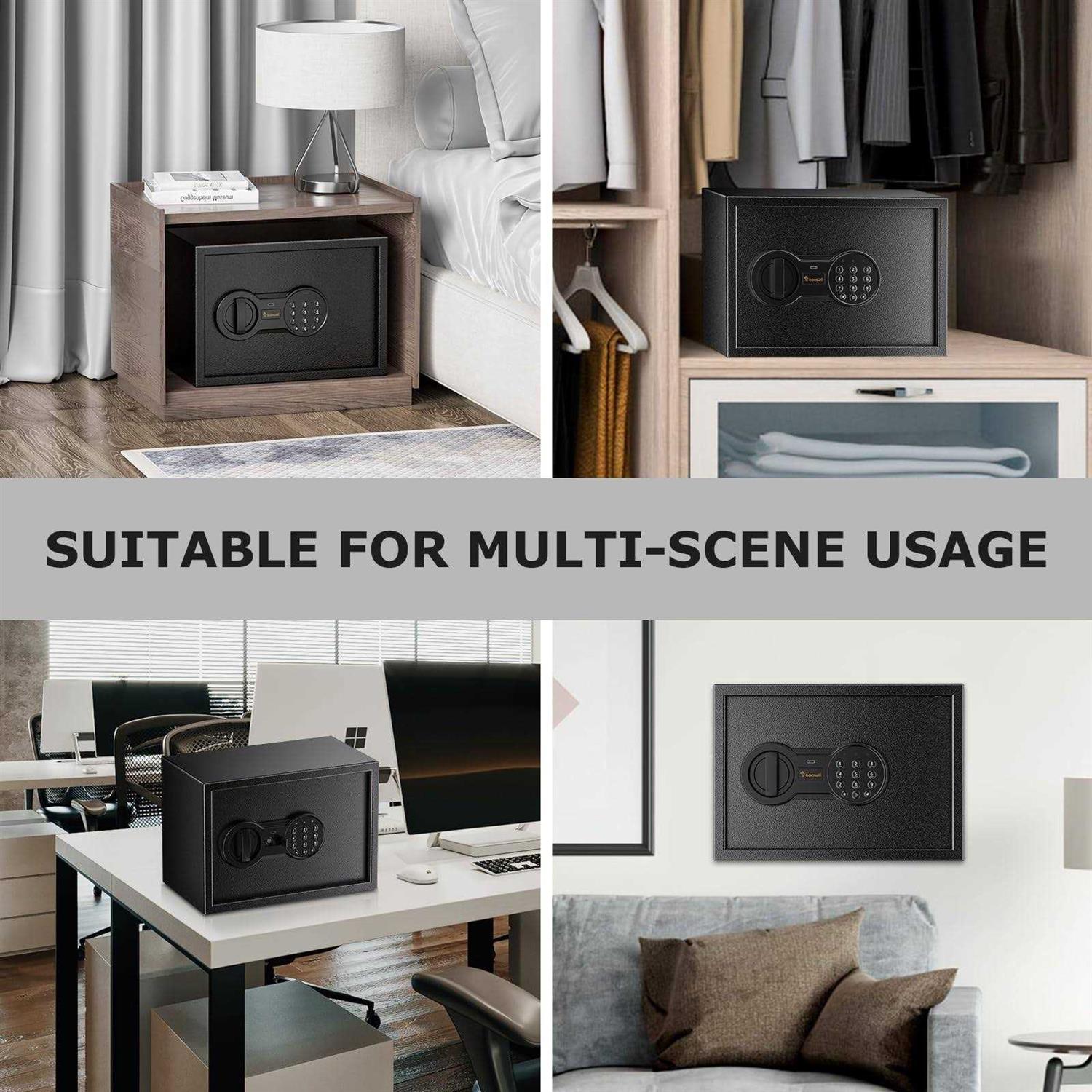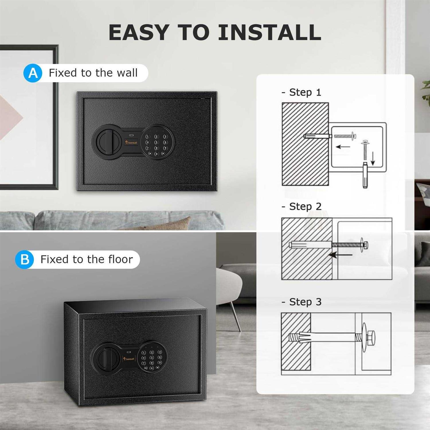 Product Specifications Dimensions: 13.78″D x 9.84″W x 9.84″H Weight: 16.7lbs / 7.6kg Capacity: 0.6 Cubic Feet Material: SPHC Steel Power Supply: 5V (Backup supply) Power Supply: 4 x 1.5V AA Batteries (Batteries Not Included) Lock Type: Electronic, Key, USB Type-C Charing Mounting Type: Floor Mount, Wall Mount Special Features SECURE AND DURABLE: This safe is constructed of SPCC steel, making it strong and reliable. It features two 18mm diameter active locking bolts, which provide maximum security and protection of your valuables. The safe has passed rigorous testing, proving its outstanding durability and material quality. 0.6 CUBIC FEET CAPACITY: The bonsaii lockable storage box comes equipped with a removable shelf, offering flexible storage options for consumers’ valuables. It can securely store important documents and jewelry with ease. Size: 13.78*9.84*9.84inches. CONCEALED & FLEXIBLE: The safe box has a felt-lined bottom to prevent any scratches on the stored items. It also features pre-drilled installation holes and comes with two expansion screws for fixing securely inside a wall cabinet. This makes it compatible for use in a range of settings including, but not limited to, homes, offices, and hotels. What’s in the Box 1 x Bonsaii Safe Box 2 x Emergency Keys 2 x Expansion Bolts 1 x User Manual 1 x Laminate