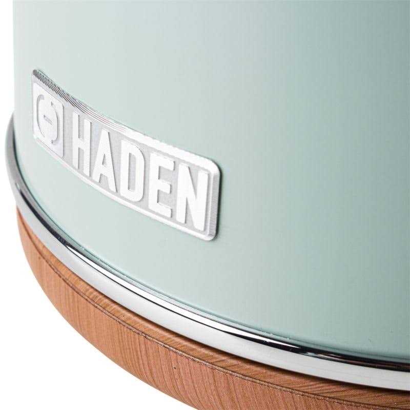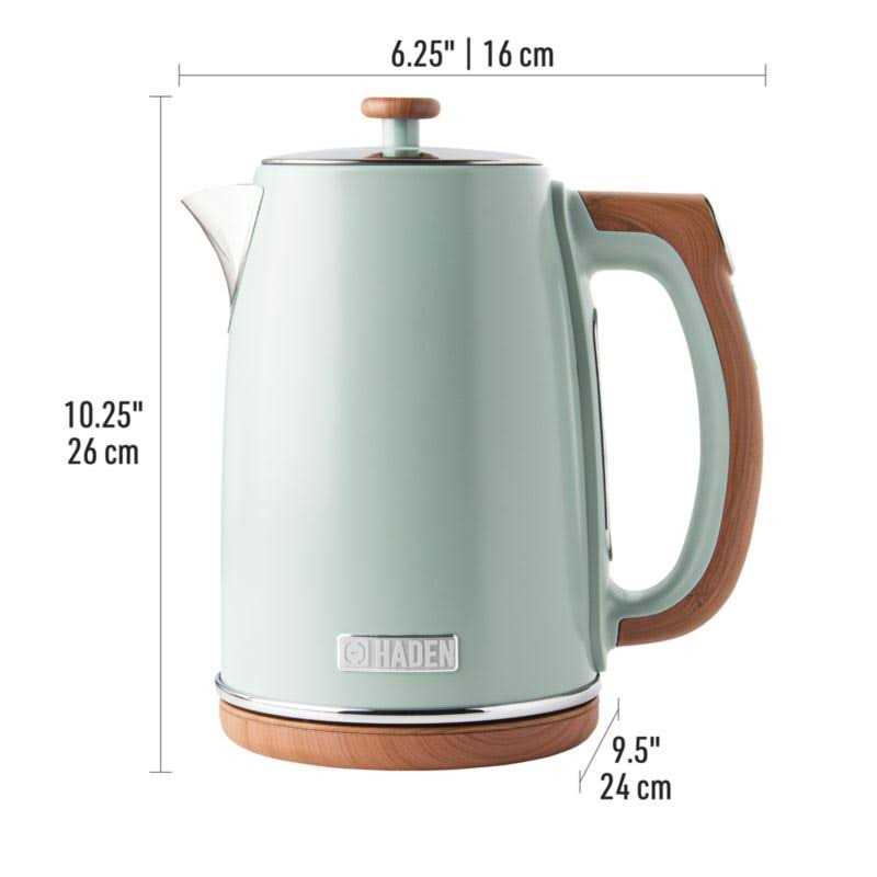 Painted glossy silt green, this stainless steel electric kettle starts your day with a warm cup of tea and a delightful pop of color. Inspired by traditional British homes, Haden brings warmth and charm to a morning essential with faux bois details, clean curves and stainless steel accents. Six preset temperatures give you options for brewing pour-over or French press coffee and various types of tea, and the kettle holds water at your desired temperature for up to 45 minutes. Pair with the matching toaster, microwave and drip coffee maker in the same soft, minty green for a coordinated kitchen with plenty of retro style Haden of England has been making kettles for 75 years.