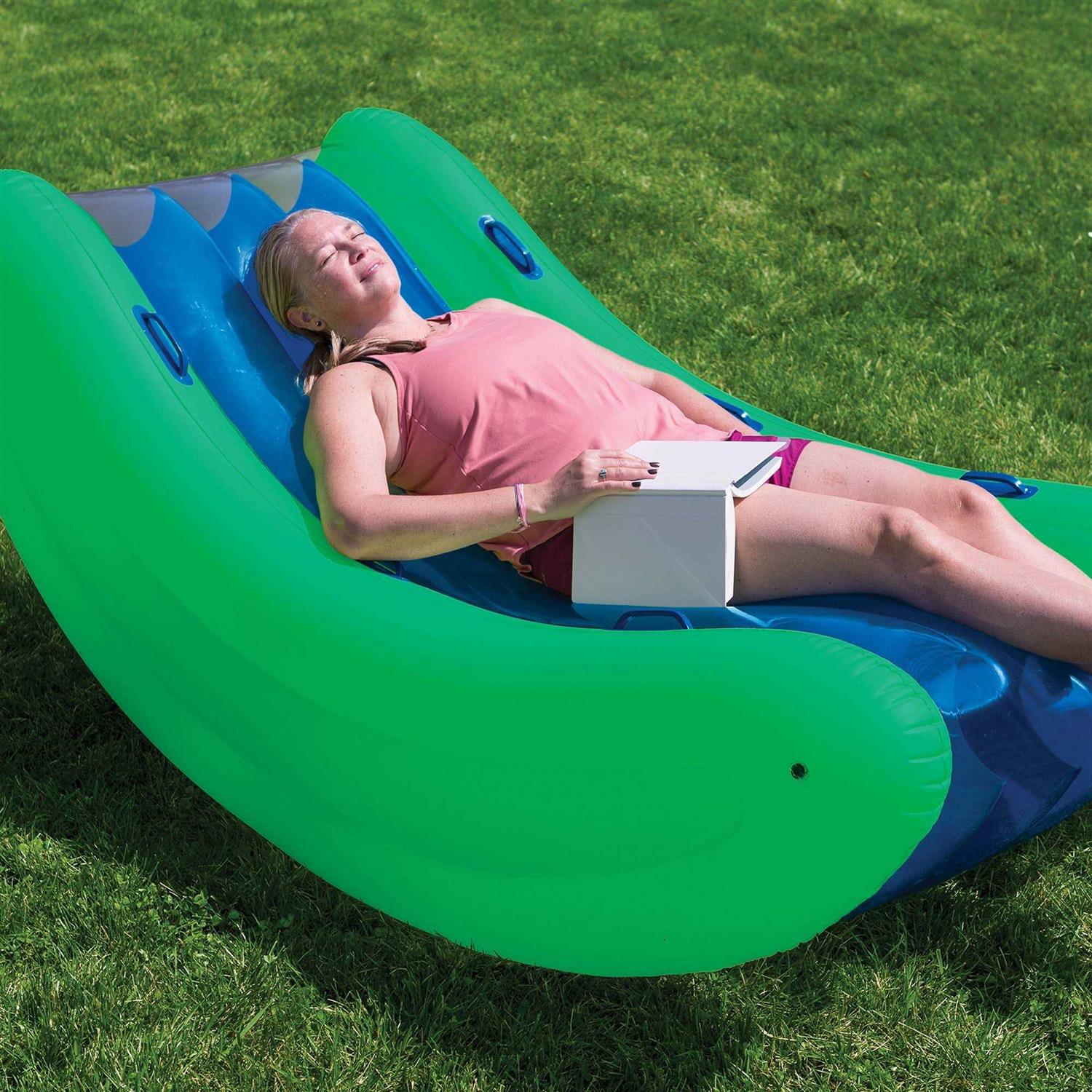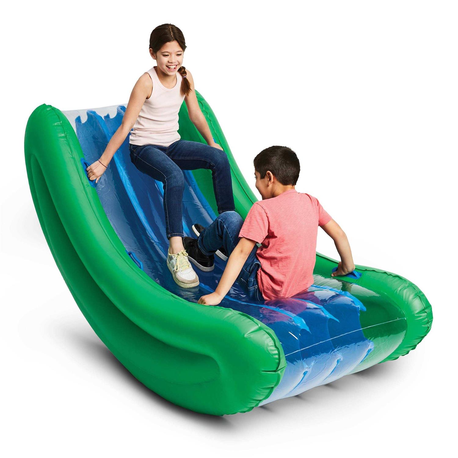 Designed for two kids (and the young-at-heart), this enormous inflatable seesaw has a curved bottom for easy rockingwith the extra challenge of trying to keep your balance while rocking the curve. Move forwards or backwards while sitting or lying downthere’s no wrong way to play! This tough inflatable rocker also becomes a relaxing place to read a book or just hang out. Three handles on each side offer plenty of places to grab onto while rocking and rolling. Extra thick vinyl will stand up to the rigors of active play, and holds up to 250 lbs. This is big play you can put awayquickly and easily inflate and deflate with 2-stage valve (pump sold separately, 733454) to make storage and transportation a cinch. Ready to rock ‘n roll? Jump on the curve and get moving!