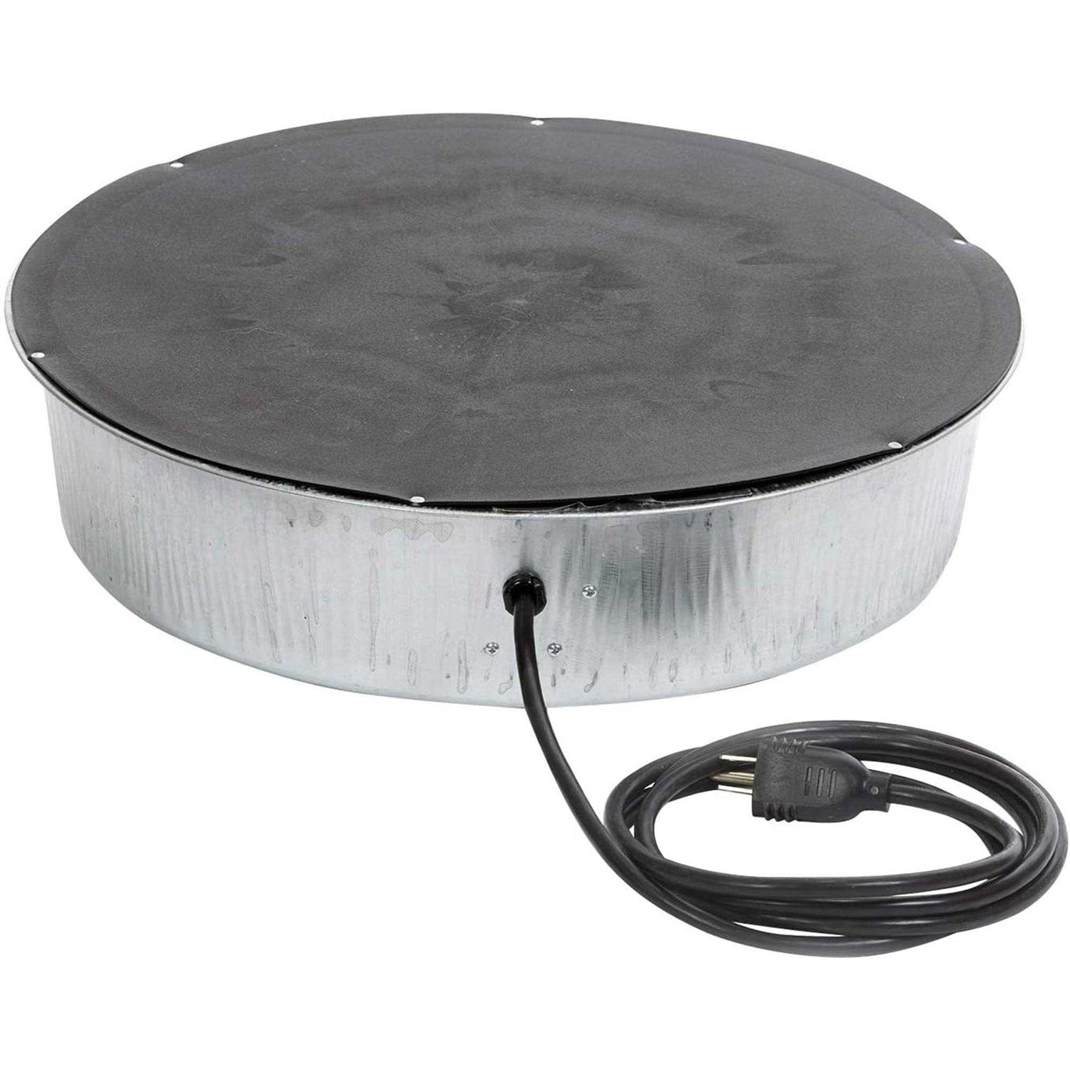 This Electric Heater Base helps prevent water from freezing in temperatures as low as 10 degrees F. Designed for use with Little Giant Double Wall Founts and other all-metal containers. The heating element has been completely redesigned for improved safety and efficiency. The fully enclosed bottom adds another layer of protection. Perfect for unheated coops and barns can be used outdoors in a dry, sheltered area. Made of heavy-duty, rust-resistant galvanized steel. Cord should be protected from animals and used with a Ground Fault Circuit Interrupter (GFCI) protected outlet. Unit will not draw electricity until temperature drops below freezing. Uses less than 1 amp per hour. 16.25 inch diameter by 3.687 inch high.
