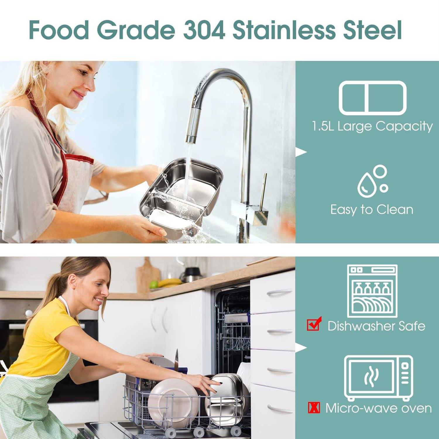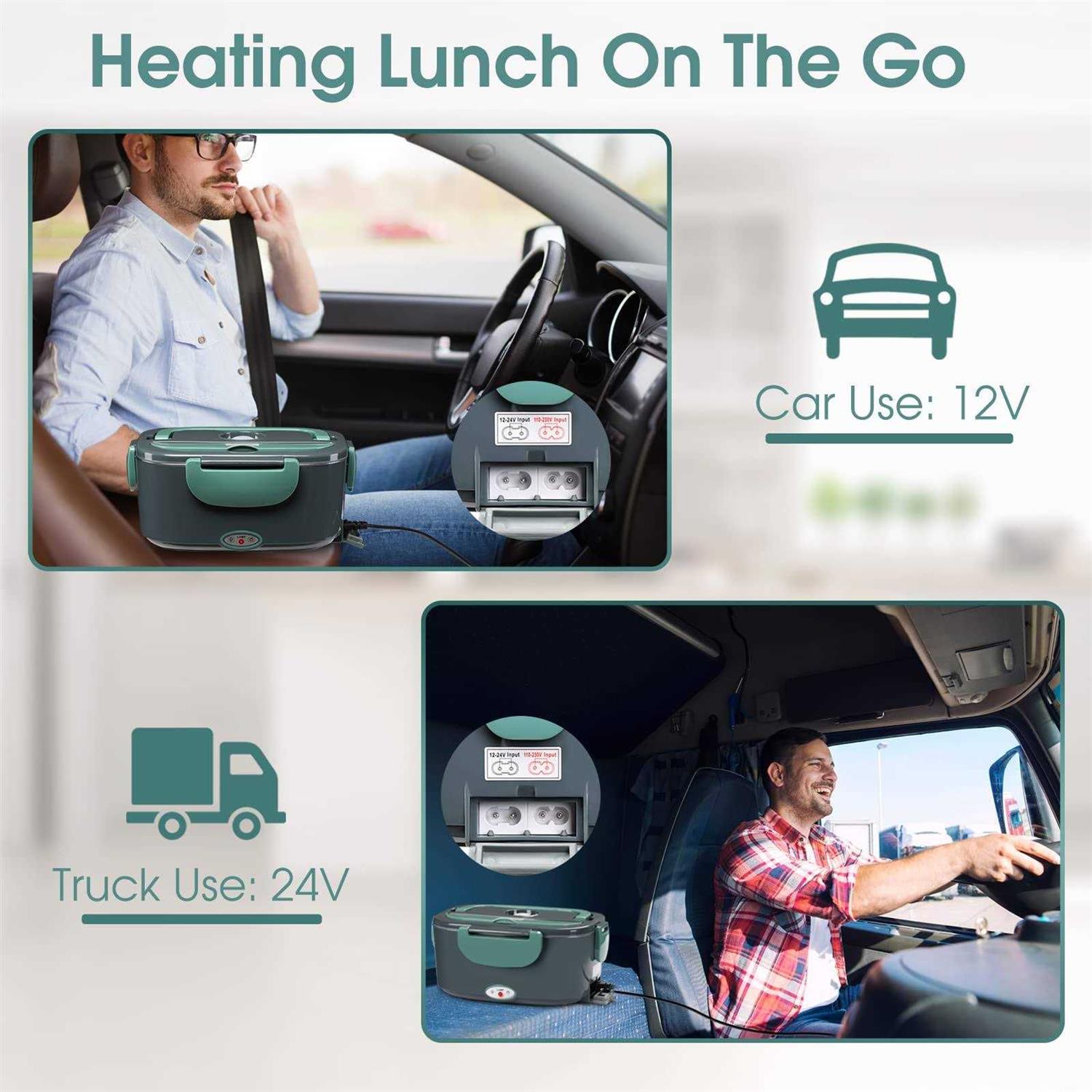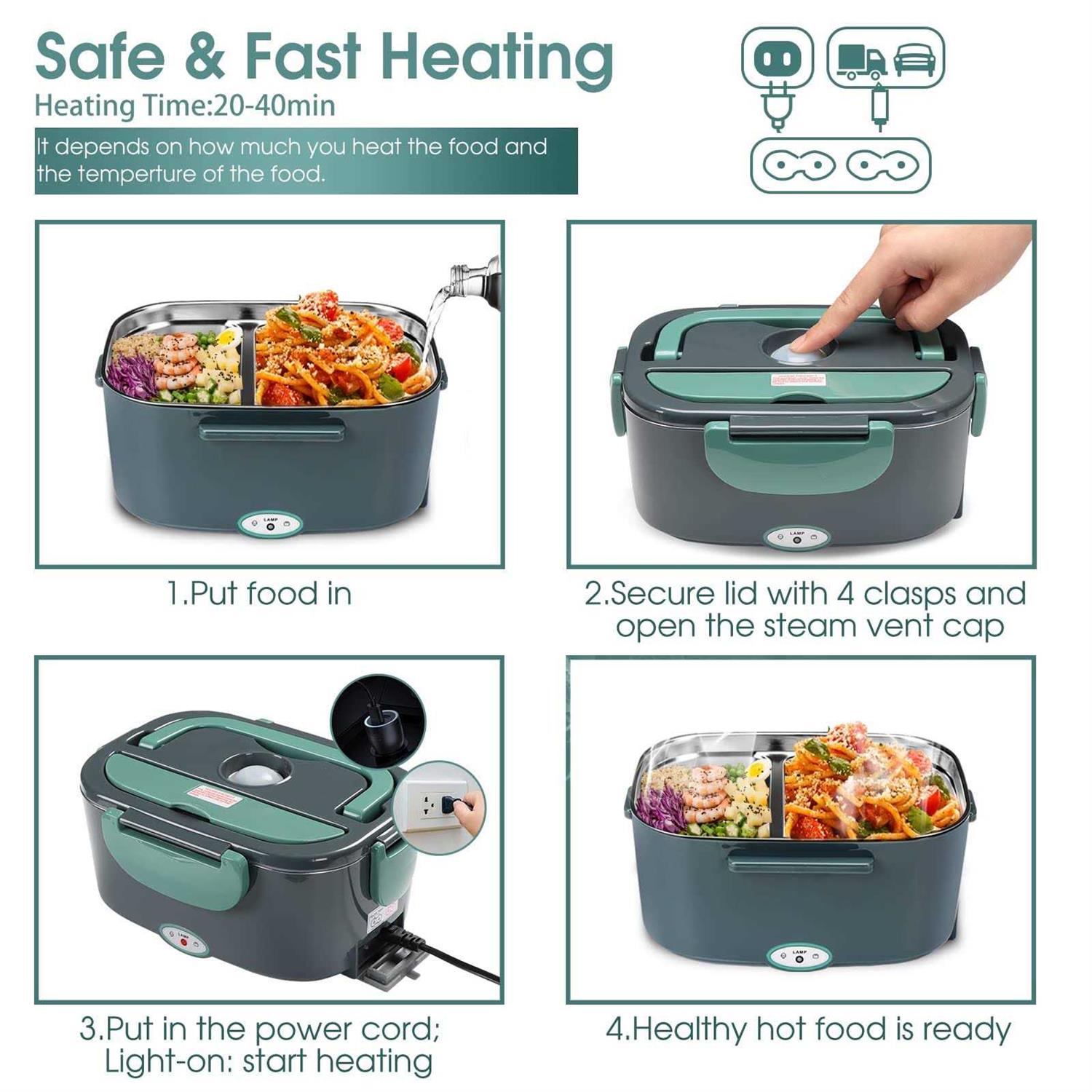 Updated Electric Lunch Box: 60W Fast Heating, More Efficient: Using 60W high-power PTc original constant temperature heating system, heating food for 20-40 minutes, super efficient and energy-saving Two compartments Design: The two compartments are designed to separate different foods and prevent food from mixing tastes Removable: The electric heating lunch box features detachable design for easy dining and cleaning Leak Proof: Silicone cover leak-proof design, and curry rice, noodles, beef stew, and potato soup can be easily carried 15L Large capacity: 15L capacity is large enough The heated lunch box is perfect for adults, men, women, school students, company office employees, construction worker and car drivers and so on Specifications: Material: Food grade PP material and 304 stainless steel Voltage: Support both cartruck use 12V24V + home use 110V220V Power Rating: 60W capacity: 15L 045L Heating Time: About 15-35Minutes How to use the electric lunch box  1Put the Food in the electric lunch box 2 Add a little water first, then close the lid 3 Plug the cable, open the steam vent cap 4 When the indicator light is on , heating is started Heating about 15-35 minutes 5 Unplug the power cord after heating is complete Package Included: 1 – 304 Stainless Steel Food container(15L) & Fruit Box(045L) 1 – 304 Stainless Steel Spoon & Fork 1* Insulated Lunch Bag 1 – carTruck charger 1 – Home Use Adapter 1 – Manual